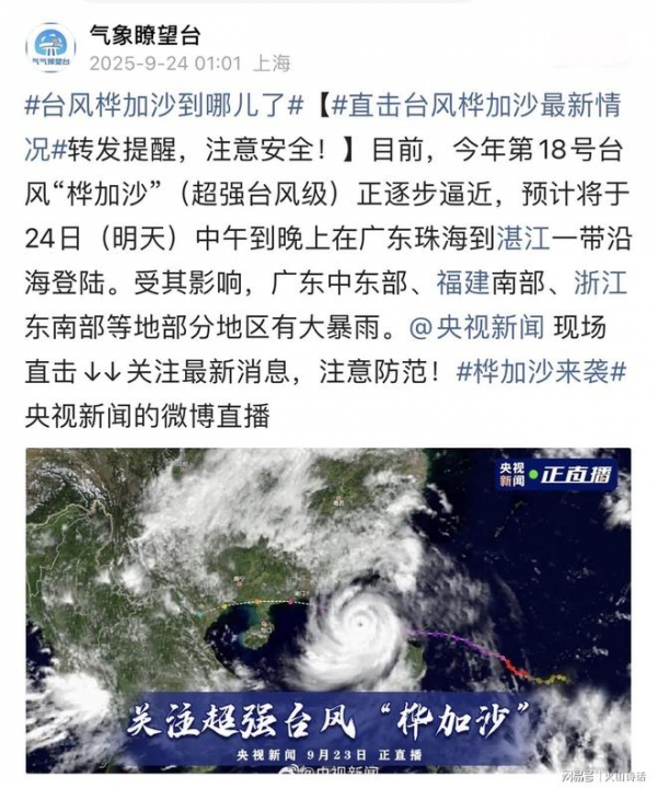 当然,这些都是小插曲。目前,今年第18号台风"桦加沙"(超强台风级)正逐步逼近,预计将于24日(今天)中午到晚上在广东珠海到湛江一带沿海登陆。受其影响,广东中东部、福建南部、浙江东南部等地部分地区有大暴雨。