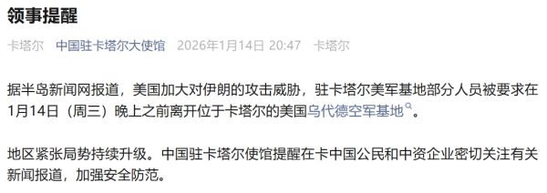 据中国驻卡塔尔大使馆微信公众号消息,1月14日晚,中国驻卡塔尔大使馆发布领事提醒: