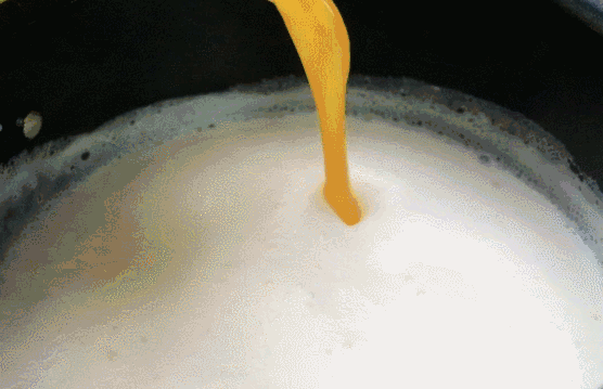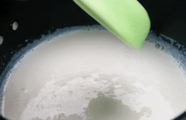 - 牛奶倒入锅中,中火加热到边缘微微冒气泡,加入小苏打迅速搅拌均匀。