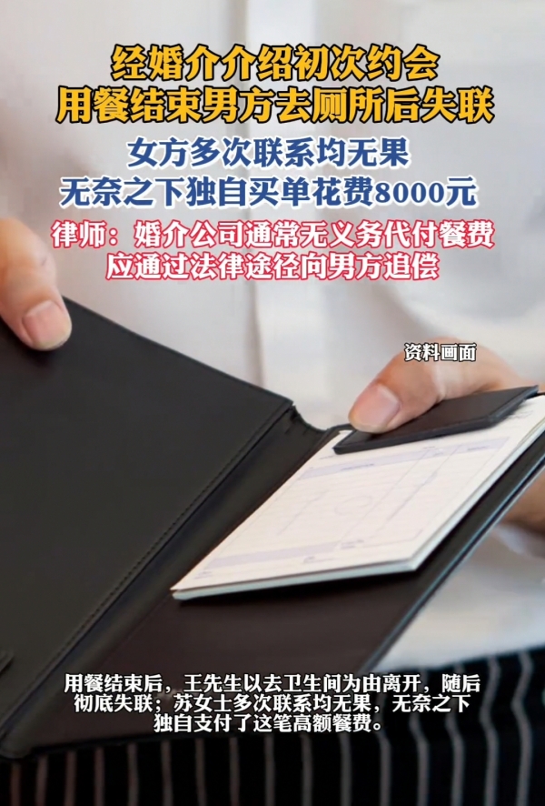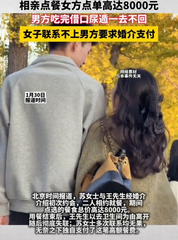上海的一位女士,经婚介介绍相亲,男方装大方请她吃饭,点了8000块的东西,结果吃完他就溜了,还把女方给拉黑了!
