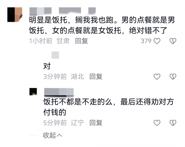 还有网友认为,很明显是饭托,搁我我也跑。男的点餐就是男饭托,女的点餐就是女饭托,绝对错不了。
