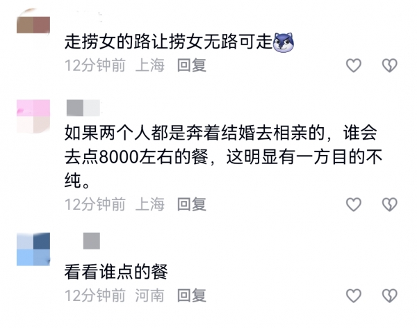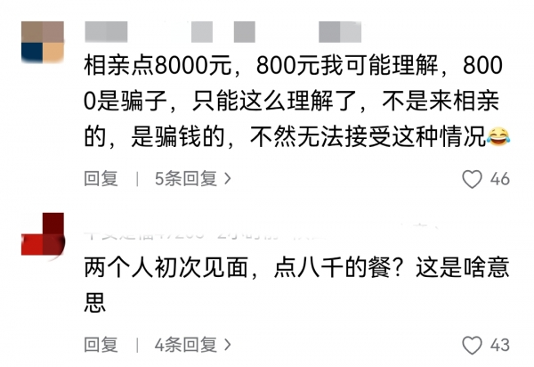 也有网友觉得,如果两个人都是奔着结婚去相亲的,谁会去点8000左右的餐呢,这明显有一方的目的不纯。