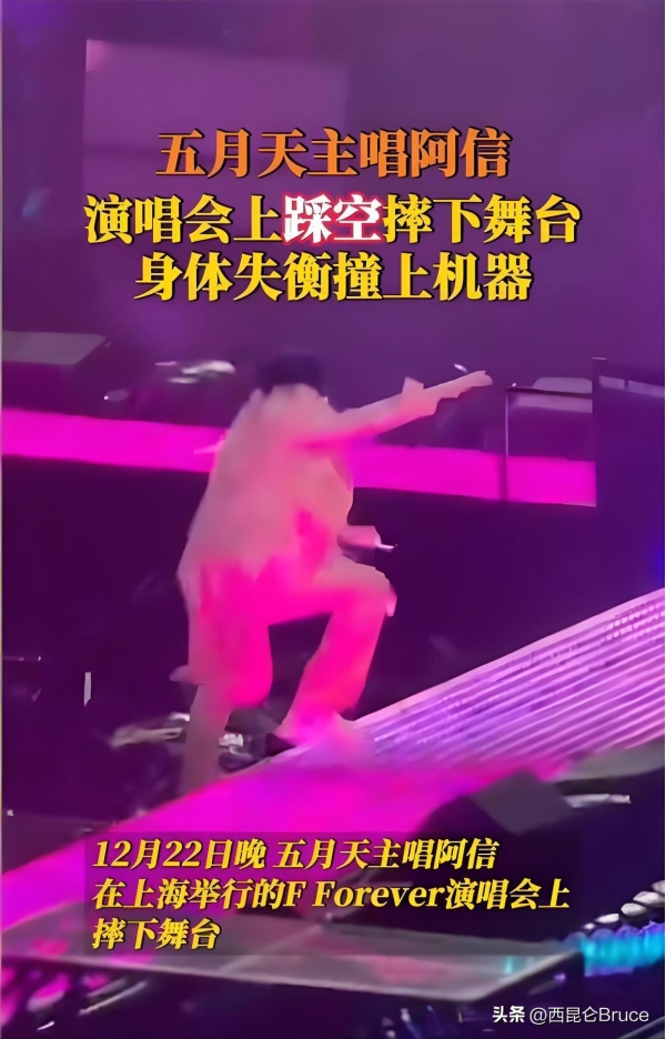 当演出进行至阿信独唱环节时,意外突生:这位50岁的歌手因舞台走位不慎踩空,从舞台边缘跌落。现场目击者拍摄的视频显示,阿信摔落后手部有明显擦伤并流血,但他迅速起身,在同伴的搀扶下重返舞台,坚持完成了后续演出。