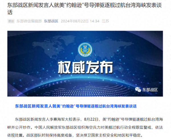 8月22日,东部战区新闻发言人就美"约翰逊"号导弹驱逐舰过航台湾海峡发表谈话。