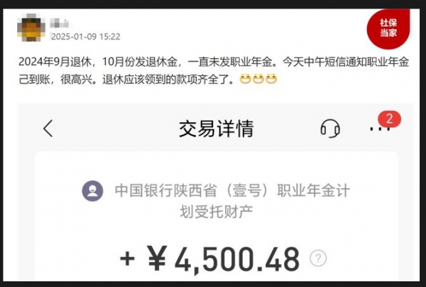 第二种是部分机关事业单位退休人员的养老金或者职业年金补发,比如说过渡期内的退休中人,有的地方还没有完成兑现,到今年1月份理顺并补发待遇,也是有可能的。比如有一位2024年9月份退休的陕西网友,他是属于过渡期内的退休中人,在今年1月份补发了4个月的职业年金,金额达到4500元。