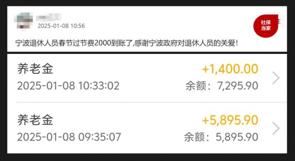还有一种情形属于统筹外的待遇发放到位,因为在春节到来前,宁波、杭州、上海等地会给退休人员发放过节费,比如宁波的标准为2000元,这笔钱已经发放到位,而且是跟养老金同一天发放的,如下图所示: