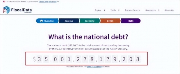 美国的国债又一次刷新了历史纪录,相较于过去30万亿美元上下的国债,此次美国公布的数据已经达到了惊人的35万亿美元。