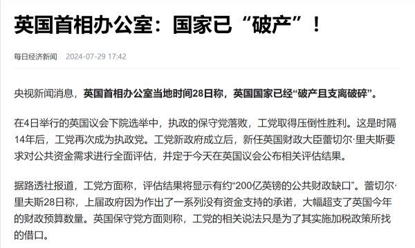 信息来源:每日经济新闻-2024-07-29-《英国首相办公室:国家已"破产"!》
