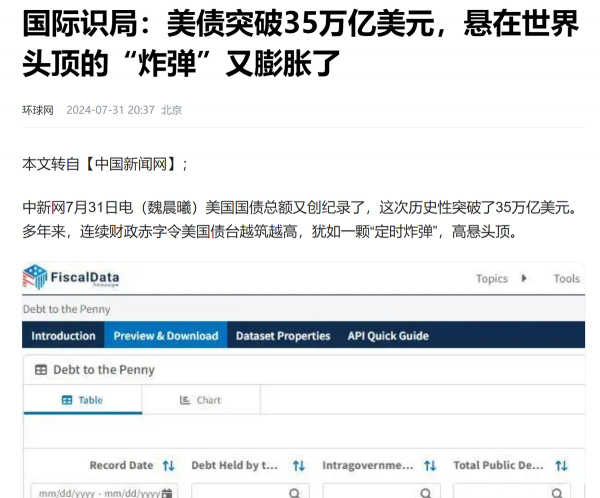 信息来源:环球网-2024-07-31-《国际识局:美债突破35万亿美元,悬在世界头顶的"炸弹"又膨胀了》