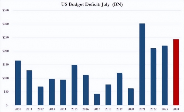 2024财政年还有两个月结束,然而美国本财政年的"赤字"已经高达1.5万亿美元,同时7月的支出中,国债利息占了四分之一。