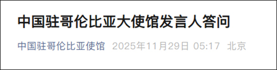 微信公众号"中国驻哥伦比亚使馆"11月29日消息,中国驻哥伦比亚大使馆发言人答问。