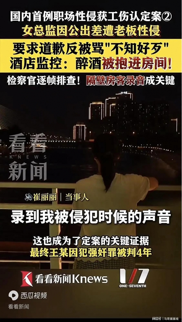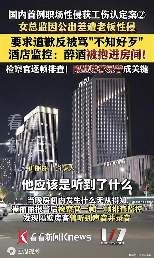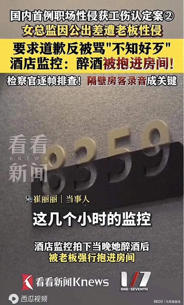 崔丽丽原是天津一家汽车零件公司销售总监,年收入过百万。2023年9月她跟老板王某去杭州谈业务,当晚监控拍下了她在酒店被强行拖进房间的画面。她报警后王某反过来指责她污蔑公司,这事闹到了检察院。
