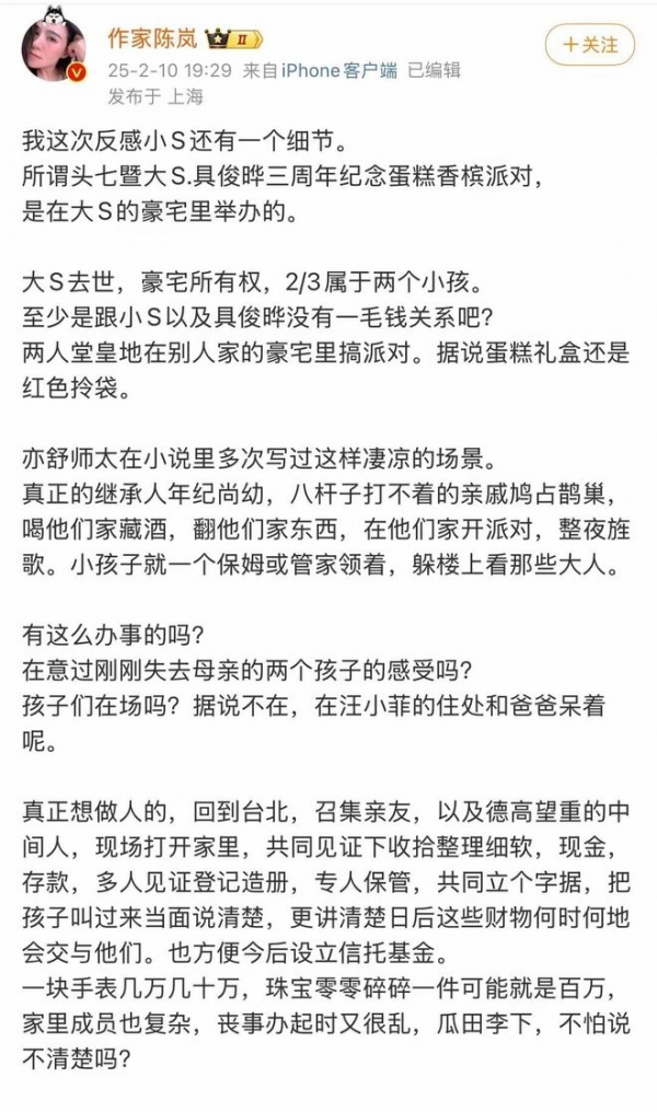 不得不说,陈岚的点评真的很到位,小S他们一家人做事真的太欠缺味道,这房子不是汪小菲的就是大S的,大S有俩孩子,所以孩子是继承人,这也是大S和汪小菲的婚后财产,和具俊晔没有半毛钱关系,s妈现在住的那套房子也是大S买的,再说这房子贷款还没有还清,小S要举办大S的头七,孩子至少要在场。