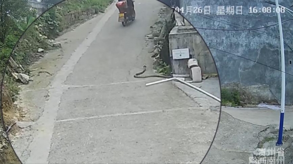 4月26日下午,路边树丛里突然窜出一条近3米长的巨型眼镜王蛇,体型粗壮、毒性极强。