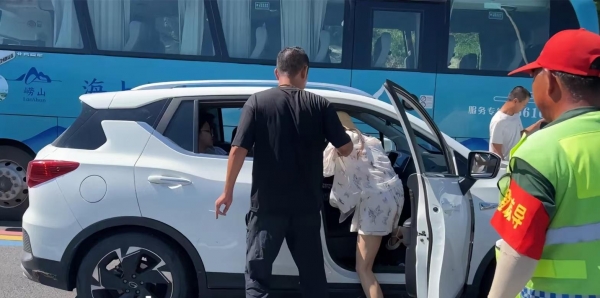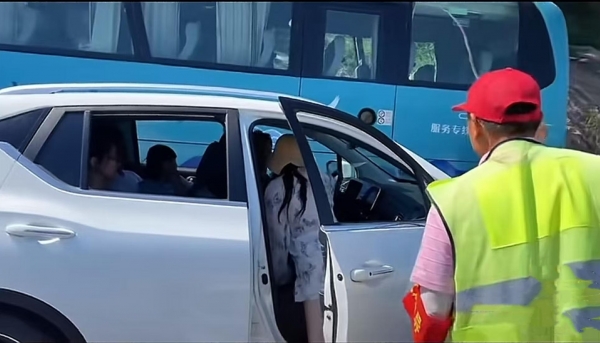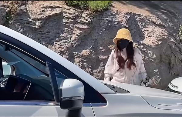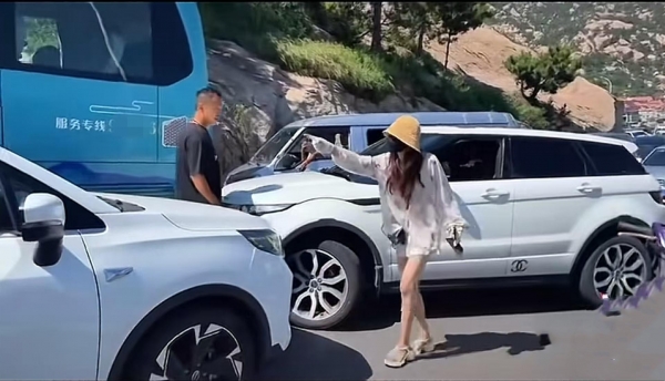 面对这种情况,白色路虎车的车主下车了,她戴着口罩,戴着一个黄色帽子,穿着正常的夏装,她的脸色非常不好。