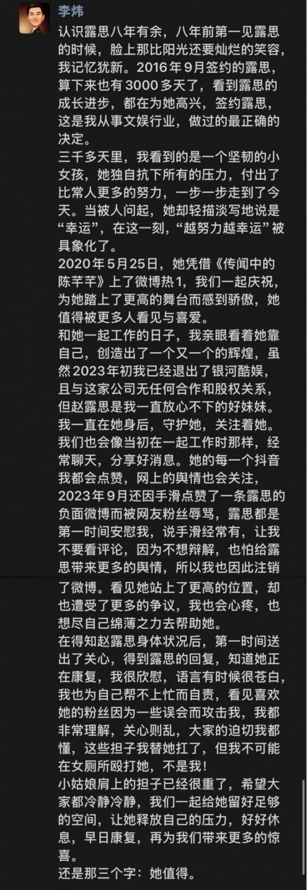 对此,赵露思经纪公司"银河酷娱"的创始人李炜发长文回应,表示目前已离开公司,也澄清他并未对赵露思动粗。