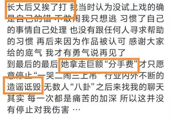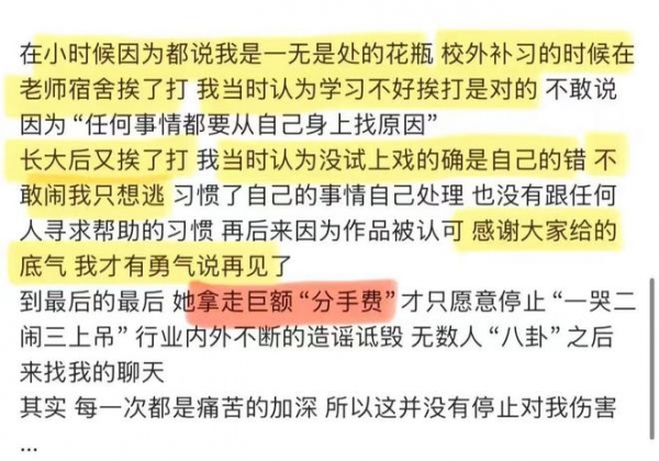 文中,她以"长大后又挨了打"开头,谈及自己从5年多前就因为遭到前老板暴力对待,而产生抑郁倾向,并控诉对方拿走巨款才肯让她离开(解约)。