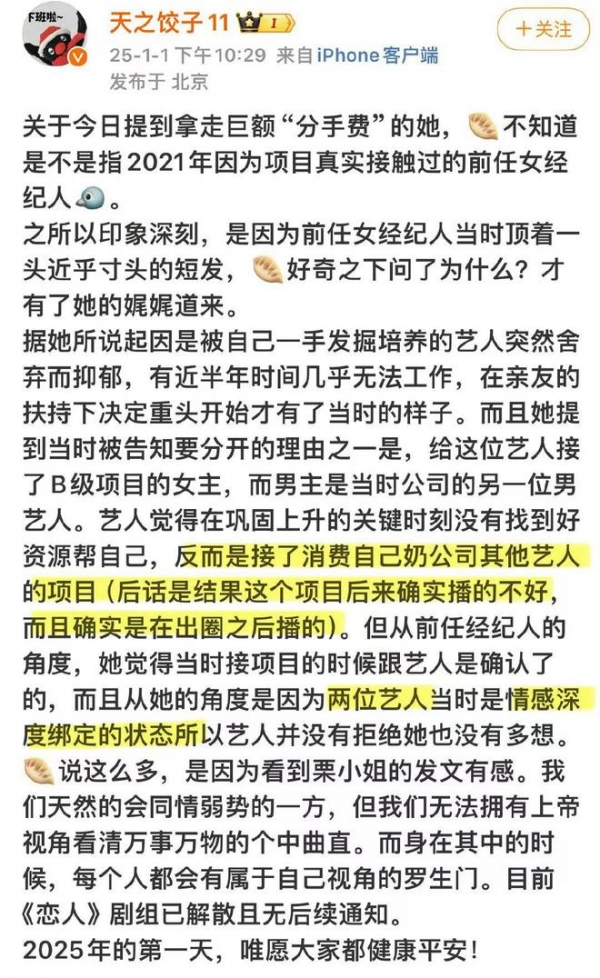账号名为"天之饺子11"的网友曝出了更多内幕: