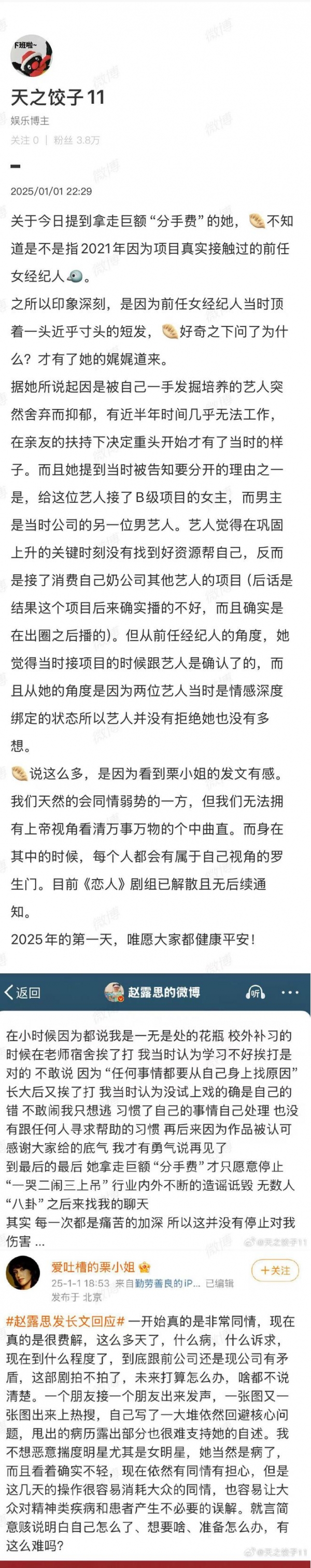 "天之饺子11"表示,赵露思与"前女经纪人"各执一词,难分对错。