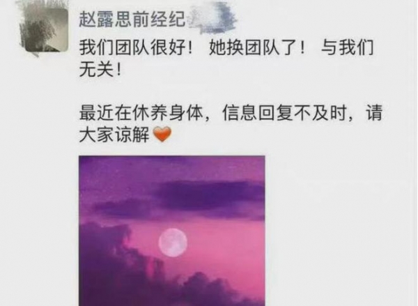 业内人士感到意外,追问"众星时代",当时,徐以若方面在朋友圈给出了回应--赵露思换了团队。
