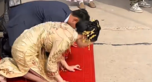 出嫁的婚车路过父亲的坟墓,新娘穿着秀禾服跪在红毯上,"咚、咚、咚"磕头--她是来告诉爸爸:"我今天嫁人啦"。