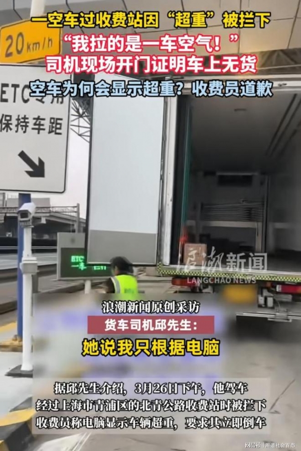 3月26日下午,上海货车司机邱先生驾驶空货车,行驶至G15北青公路收费站时,被现场收费员直接拦停,理由更是让人哭笑不得,收费员表示电脑系统显示车辆超重,要求邱先生立刻倒车。明明车厢里空空如也,连一件货物都没有,怎么可能存在超重问题,邱先生第一时间跟收费员解释,自己驾驶的是空车,根本不存在超载的情况,可不管他怎么说,收费员都不为所动,态度十分强硬,直接表示只认电脑上的记录,不管车辆到底是不是空车,完全不给邱先生辩解的机会,也没有上前查看车辆的实际情况,就单方面判定车辆超载。