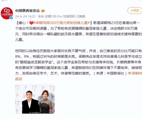 事实上,梁朝伟的慈善足迹远不止于此。2025年6月,他以"627公益季"名义参与儿童癌病基金筹款,单次活动捐出100万港元;而在2024年6月,他个人捐资300万港元设立"鹏程奋进坚毅奖学金",专门资助长期病患及基层儿童教育,更捐出珍藏的赵无极画作拍卖以扩大资助范围。值得关注的是,这些捐款多数通过机构专项通道进行,从未进行公开炒作,展现了他低调务实的公益态度。