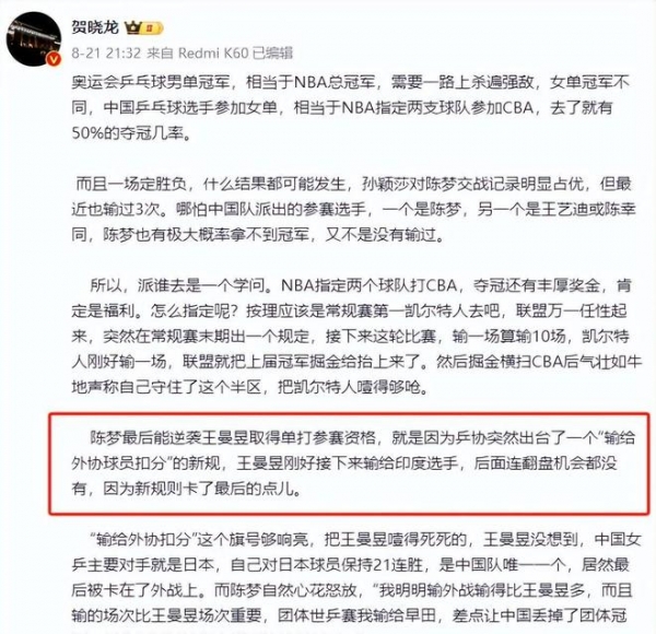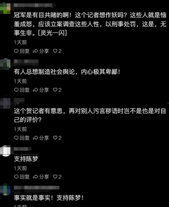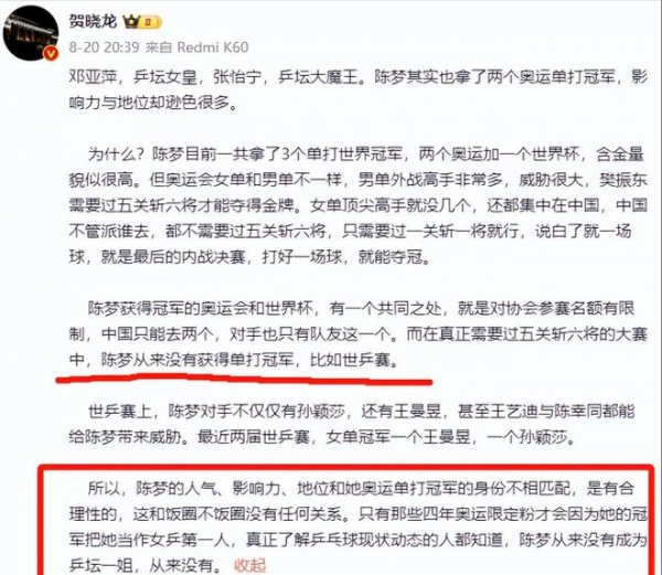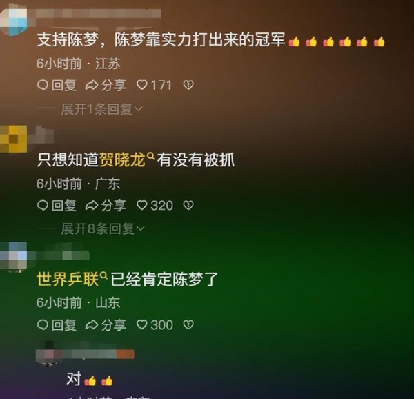 网上的朋友们也都不干了,纷纷站出来给陈梦撑腰。大家都说,冠军那是靠实力拿回来的,贺晓龙的话太偏激、太不负责任了。他这么一闹,不光让运动员心里难受,还把国乒的形象给弄坏了。