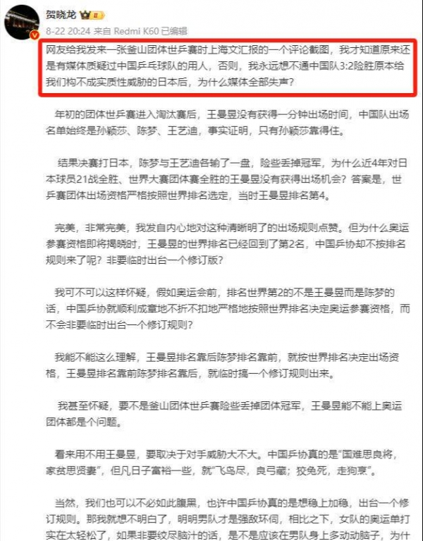 前体育记者贺晓龙连着好几天对着国乒女队主力陈梦一顿猛批,说陈梦配不上冠军的名号,还怀疑她冠军的含金量和参赛资格。这一下子可就引起了大伙的强烈关注和热烈讨论。