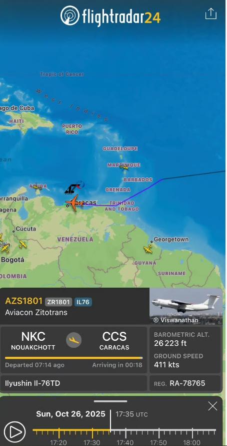 几乎同一时间,一架疑似隶属于俄瓦格纳佣兵集团的伊尔-76TD运输机从北非起飞,最终降落在委内瑞拉首都机场。