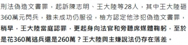 在侦察期间,警方发现王大陆支付了陈某360万台币,通过陈某逃兵役。