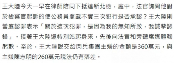 但陈某此前表示只收了王大陆260万台币,两人口径不一。