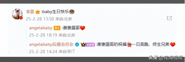2025年2月28日13:50,李晨在社交平台为Angelababy送上36岁生日祝福,留言"baby生日快乐",该时间点被网友破译为"一生我护"。Angelababy迅速回应"谢谢晨哥",后援会跟评"一日奔跑,终生兄弟",强化了两人在《奔跑吧》中的"家族情谊"。