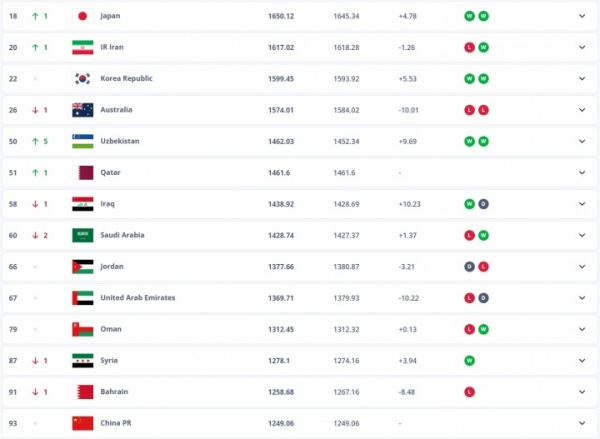 最新FIFA世界排名亚洲前十:
