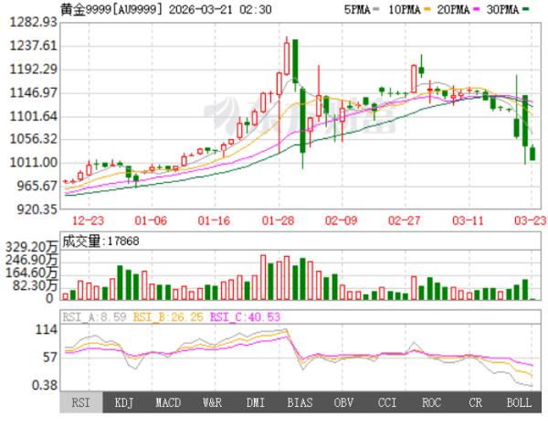 截至周五(3月20日)纽约尾盘,现货黄金跌3.42%,报4491.67美元/盎司,本周累计下跌超10%;COMEX黄金期货跌2.47%,报4492美元/盎司,本周累跌超11%。