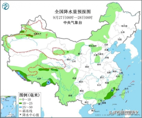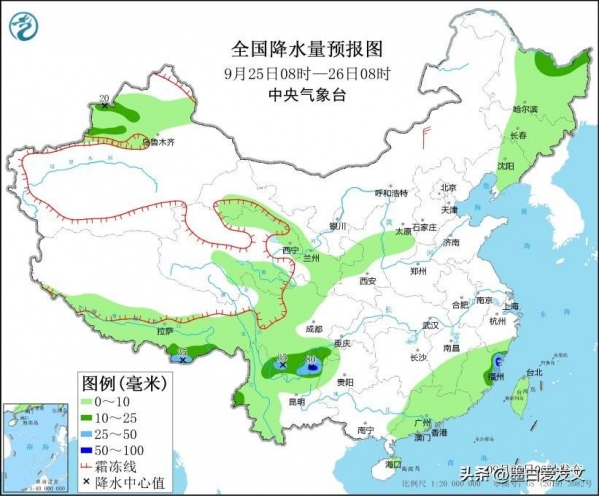 预计9月25号早上8点到26号早上8点,新疆的伊犁河谷啊,还有天山北边儿,黑龙江的北头,四川的南边,云南的北边,福建的东边,还有西藏的东南角,这些地方啊,都会下起中到大雨。特别是云南的东北边和福建东北边的海边,雨会特别大,得叫暴雨了,大概能有50到80毫米呢。