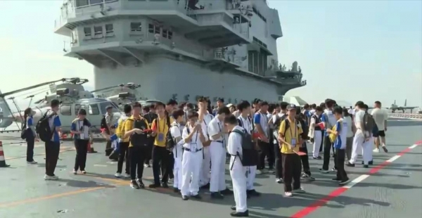 活动当天,700名海军官兵在甲板上排出"国安家好"四个大字,舰载机歼-15T一字排开,成千上万市民提前抢票排队登舰参观,香港的社交媒体几乎被刷屏。香岛中学的小朋友们眼睛都不够用了,直呼"这辈子忘不了"。