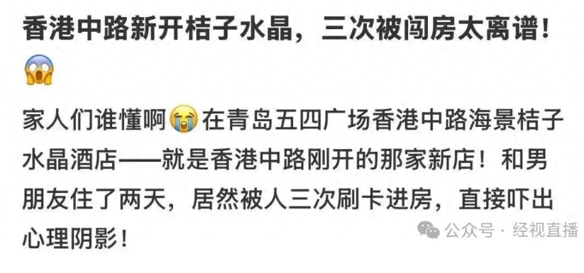 李女士介绍,她与男友花费近500元,提前在某短视频平台预订了两晚酒店,该酒店在平台的名称为"青岛五四广场香港中路海景桔子水晶酒店"。12月26日21时40分许,突然有人刷卡打开李女士房门,"我被吓得整晚不敢入睡。"