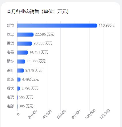 其中,超市以11.10亿元的销售额"断层领跑",这一成绩不仅超第二名(珠宝业态2.26亿元)近5倍,更占据当月总销售额的半壁江山;百货、电器、服装分别录得2.06亿元、1.48亿元、1.11亿元的成绩。五大业态合计贡献超当月总销售额的90%。