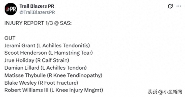 本场比赛的对手马刺也更新了伤病报告。马刺官方宣布,文班亚马因膝盖酸痛,本场比赛将缺战。这是文班亚马本赛季缺席的第14场比赛,此前他缺战的13场比赛中,马刺取得10胜3负。瓦塞尔因左内收肌拉伤也将缺阵。