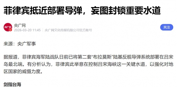菲律宾的胆子是越来越肥了,不光盯着南海挑衅,还把黑手伸向台海,直接将导弹部署在对台第一线。而解放军的反制也立马就到,将连射4天实弹,菲律宾火中取栗只会引火烧身。