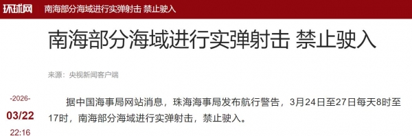 据环球网报道,日前中国海事局发布航行警告,24日至27日解放军将在南海举行实弹射击,禁止一切无关船只驶入。