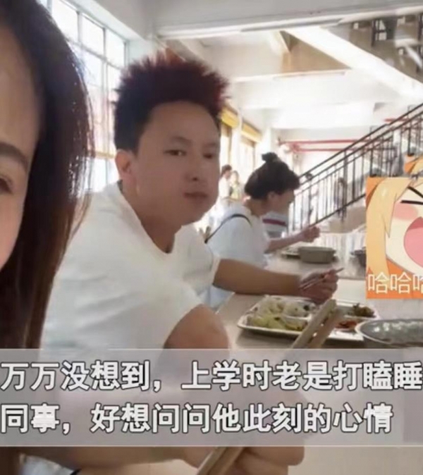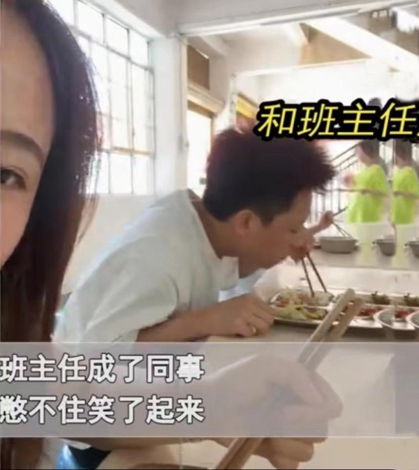 于是,她一边吃饭,一边自拍,因为正好可以拍到班主任,就是想看看他看到自己是什么表情。应该说班主任也知道她的小心思,故意的露了一下帅气的脸,班主任的表情还是表现的有点五味杂陈的,用他自己的话说,这个世界太小了,昔日的学生竟然和自己都是同事了。