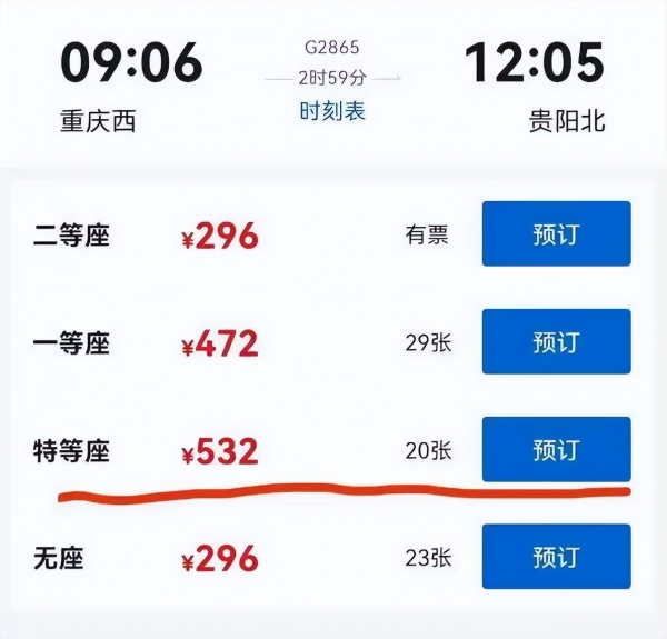 据了解,8月28日上午,该网友乘坐从重庆西至贵阳北的G2865次列车,购买了2F号特等座,票价为532元。相比之下,同趟列车一等座票价为472元,二等座仅为296元。然而,该特等座位于过道旁,是单独的一个座椅,腿部空间目测仅有20余厘米,前方紧挨着柜子,乘客坐下后膝盖几乎顶到柜子,上半身也离柜子很近。