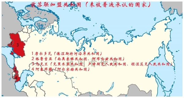 苏联解体后,俄罗斯继承了前苏联的债务,同时继承了绝大部分权利。前苏联各加盟共和国成为主权独立的国家后,俄罗斯仍然试图把这些国家视为自己的势力范围,在不少国家驻扎军队,建有军事设施。有些国家依然亲近俄罗斯,把俄罗斯当大哥;有些国家对俄罗斯敬而远之,积极投入北约的怀抱;有些国家也想投入北约怀抱,无奈俄罗斯在自己的地盘上插了钉子,难受至极。本文就来盘点一下这些钉子--前苏联地区未被国际社会普遍承认的国家。