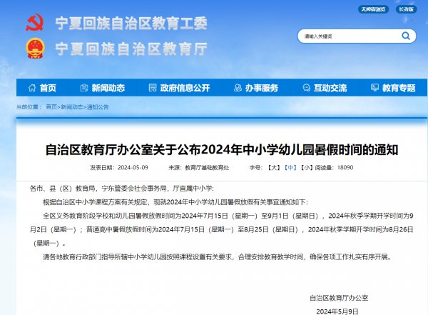 上海的中小学是2024年9月2日开学,2025年1月17日结束,寒假从2025年1月20日开始,2月14日结束。宁夏教育厅在相关内容中表示全区义务教育阶段学校和幼儿园暑假放假时间为2024年7月15日(星期一)至9月1日(星期日),2024年秋季学期开学时间为9月2日(星期一)。
