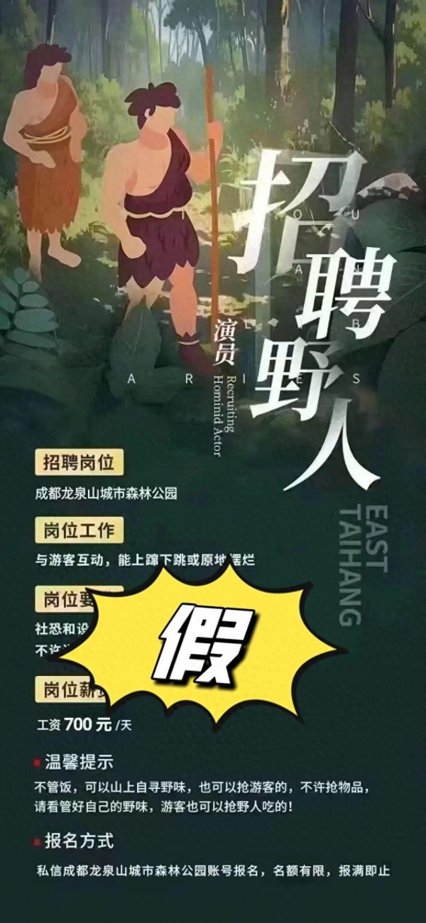近日,网传一张招募图片称成都龙泉山城市森林公园招聘"野人",工作内容为"与游客互动,能上蹿下跳或原地摆烂",薪资为每天700元。在该"招聘启事"底部还标注了可以私信成都龙泉山城市森林公园账号报名。