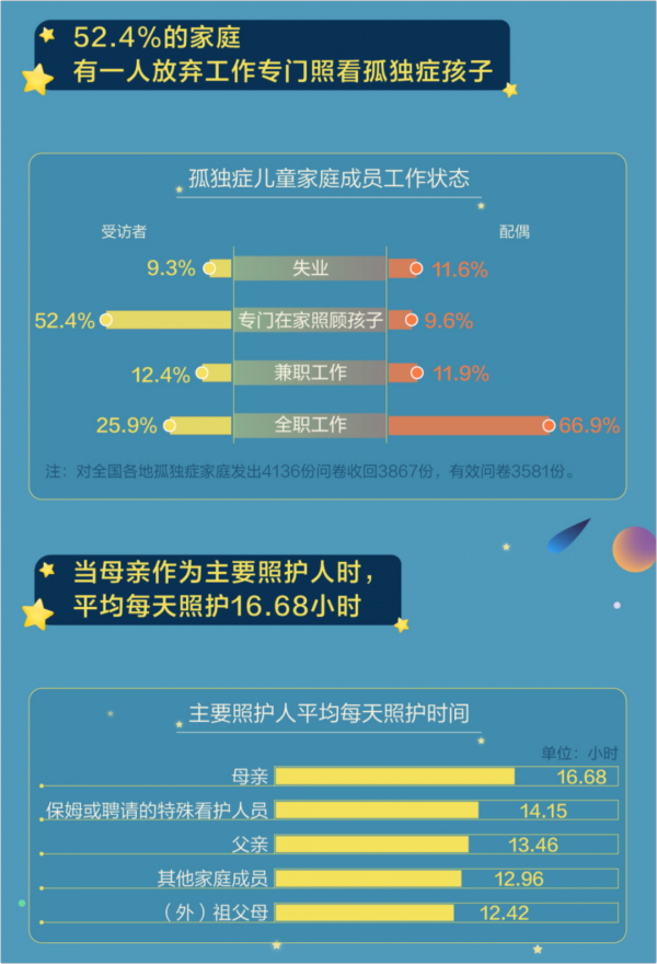 新京报的一则报道显示,全国约有52.4%的孤独症家庭,会有一人放弃工作专门照看孤独症孩子,而当母亲作为主要照护人时,平均每天照护时间要高达16.68小时。