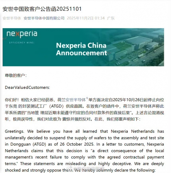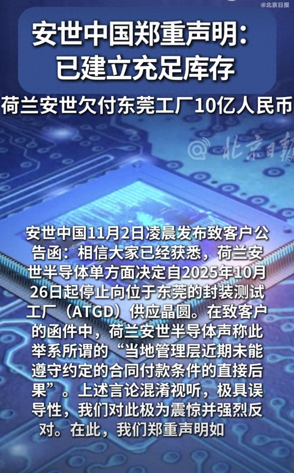事件的引爆点在2025年10月26日。荷兰安世半导体单方面宣布,停止向东莞封装测试工厂(ATGD)供应晶圆,给出的理由是"中国管理层未遵守合同付款条件"。这番表态立刻遭到安世中国的强硬反驳。安世中国明确表示,自身不存在任何违约行为,相反荷兰安世半导体还欠付ATGD货款高达10亿元人民币,指责荷方的指控是无中生有的恶意抹黑。安世中国进一步指出,荷兰管理层将个人利益凌驾于公司整体利益之上,严重违背职业操守和公司治理原则,应当对造成的损失承担法律责任。