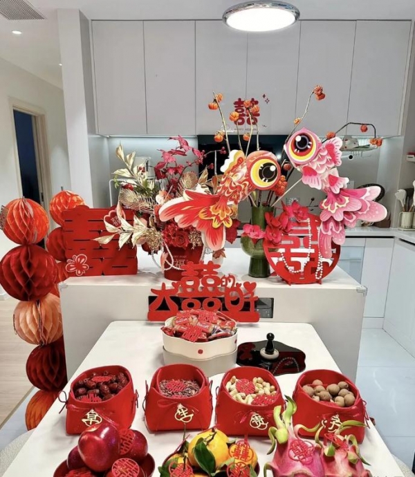 茶几上也放满了喜庆的元素,有长长的喜字,红色的摆件,以及红色的酒瓶,搭配上红色的喜庆花束,别提多用心了!满满的全是对婚姻的憧憬~